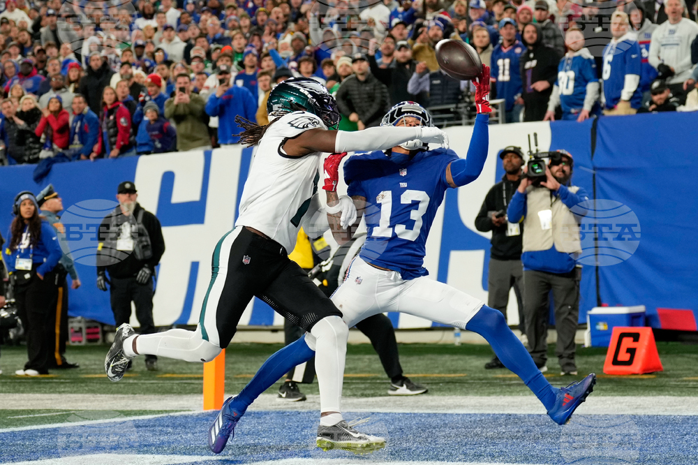 Philadelphia Eagles' Kelee Ringo, left, interferes with New York Giants' Jalin Hyatt during the second half of an NFL football game Thursday, Oct. 9, 2025, in East Rutherford, N.J. (AP Photo/Seth Wenig)