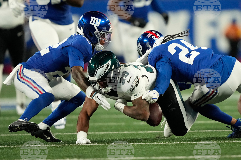 Philadelphia Eagles' AJ Dillon (29) fumbles the ball against New York Giants' Dane Belton (24) and Andru Phillips (22) during the second half of an NFL football game Thursday, Oct. 9, 2025, in East Rutherford, N.J. (AP Photo/Yuki Iwamura)