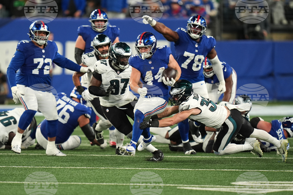 New York Giants' Gunner Olszewski, left, is tackled by Philadelphia Eagles' Cameron Latu during the first half of an NFL football game Thursday, Oct. 9, 2025, in East Rutherford, N.J. (AP Photo/Seth Wenig)