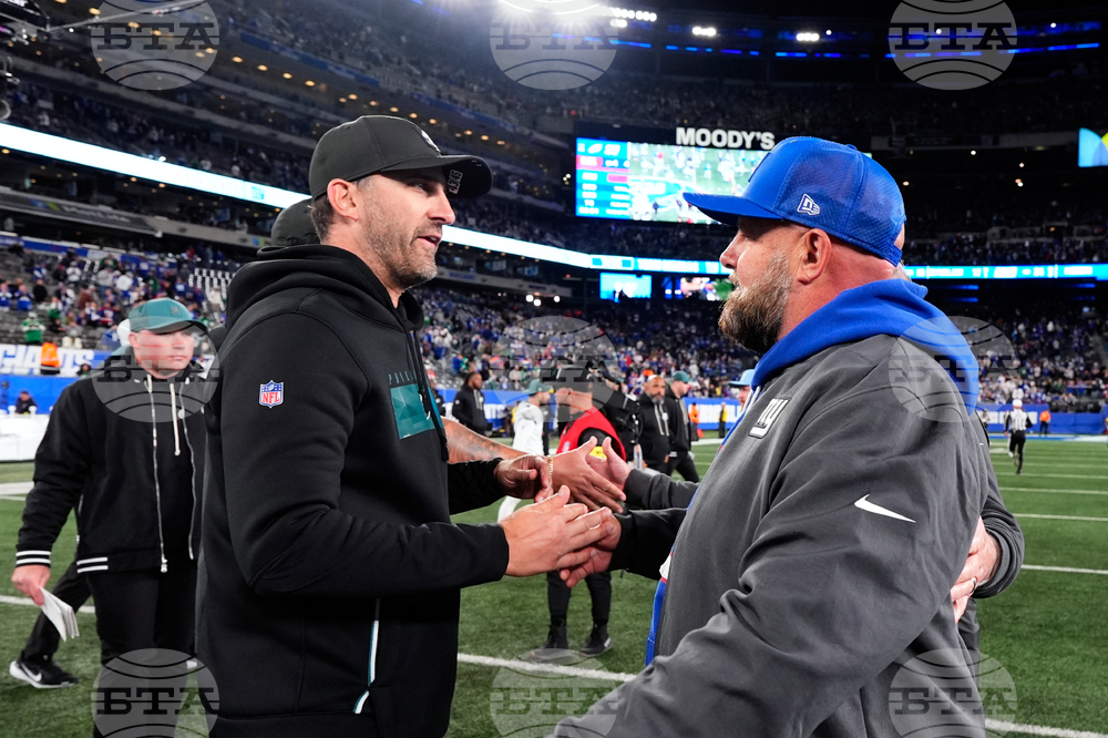 Philadelphia Eagles' Nick Sirianni, left, and New York Giants' Brian Daboll meet after an NFL football game Thursday, Oct. 9, 2025, in East Rutherford, N.J. (AP Photo/Yuki Iwamura)