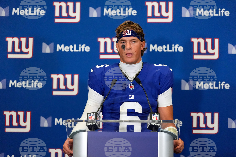 New York Giants' Jaxson Dart speaks during a news conference after an NFL football game against the Philadelphia Eagles Thursday, Oct. 9, 2025, in East Rutherford, N.J. (AP Photo/Yuki Iwamura)