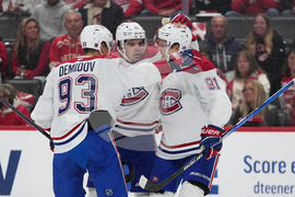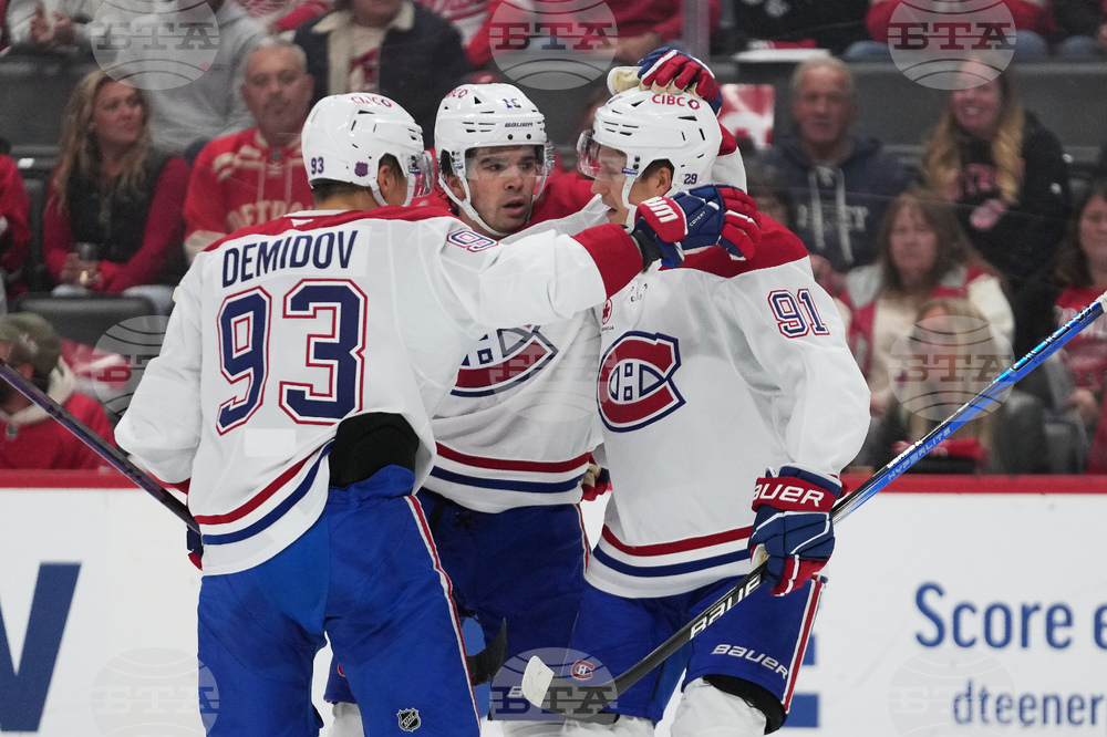 Montreal Canadiens center Oliver Kapanen (91) celebrates his goal with Ivan Demidov (93) and Alex Newhook (15) in the first period of an NHL hockey game Thursday, Oct. 9, 2025, in Detroit. (AP Photo/Paul Sancya)