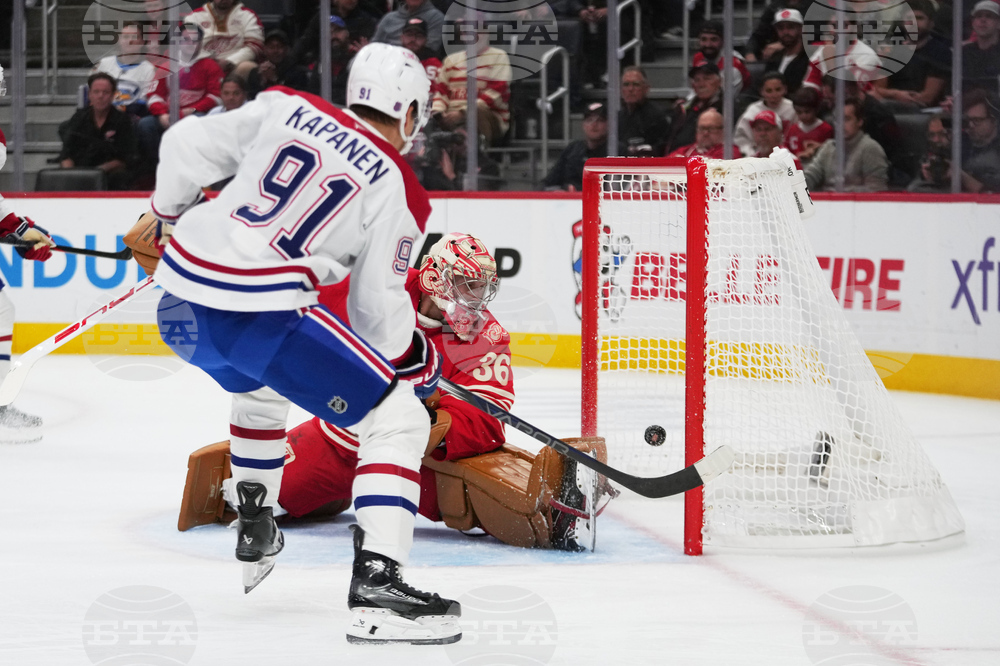 Montreal Canadiens center Oliver Kapanen (91) scores on Detroit Red Wings goalie John Gibson (36) in the first period of an NHL hockey game Thursday, Oct. 9, 2025, in Detroit. (AP Photo/Paul Sancya)