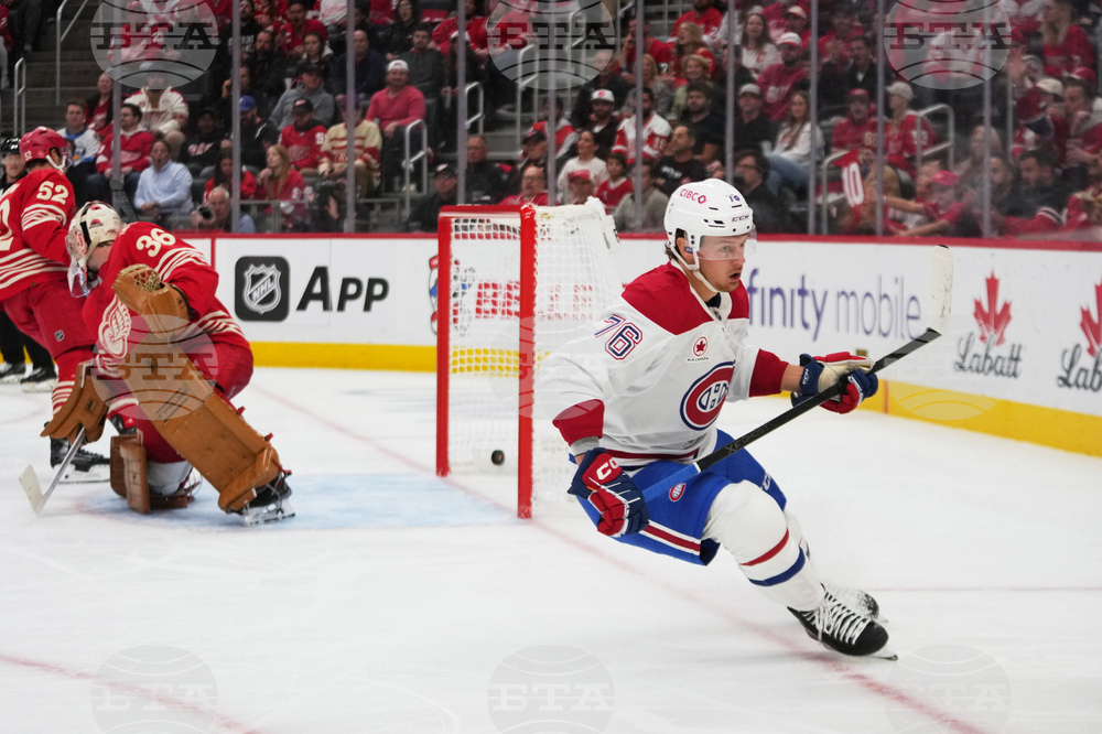 Montreal Canadiens right wing Zack Bolduc (76) scores on Detroit Red Wings goalie John Gibson (36) in the first period of an NHL hockey game Thursday, Oct. 9, 2025, in Detroit. (AP Photo/Paul Sancya)