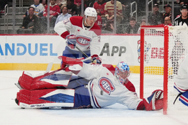 Montreal Canadiens goaltender Jakub Dobes (75) stops a Detroit Red Wings shot as Montreal Canadiens defenseman Kaiden Guhle (21) looks on in the second period of an NHL hockey game Thursday, Oct. 9, 2025, in Detroit. (AP Photo/Paul Sancya)