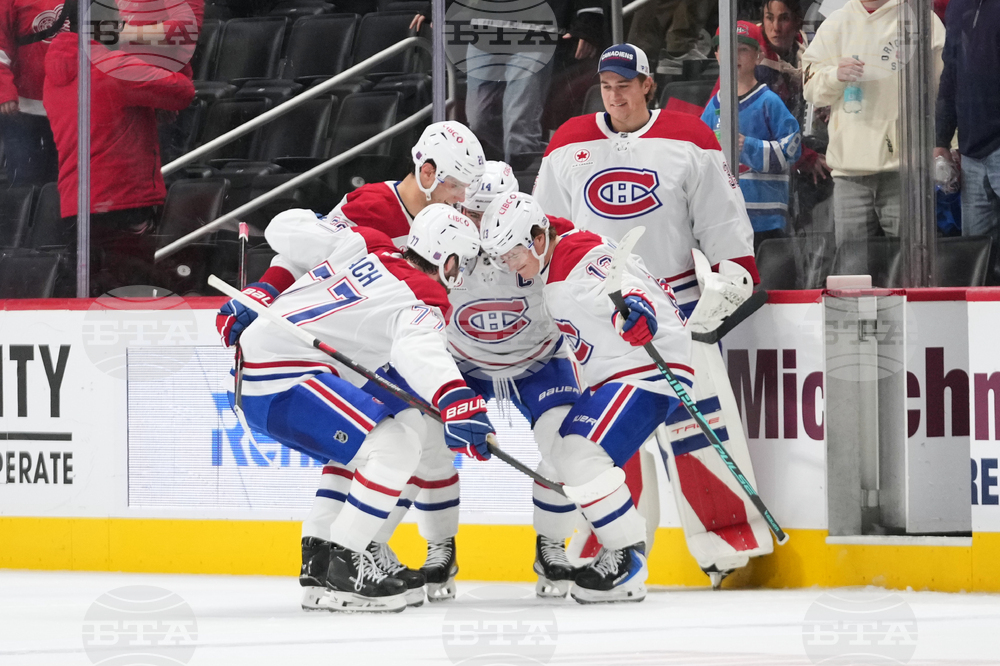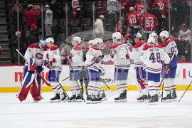 Montreal Canadiens players celebrate after an NHL hockey game against the Detroit Red Wings Thursday, Oct. 9, 2025, in Detroit. (AP Photo/Paul Sancya)