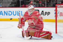 Detroit Red Wings goaltender Cam Talbot (39) stops a Montreal Canadiens shot in the third period of an NHL hockey game Thursday, Oct. 9, 2025, in Detroit. (AP Photo/Paul Sancya)