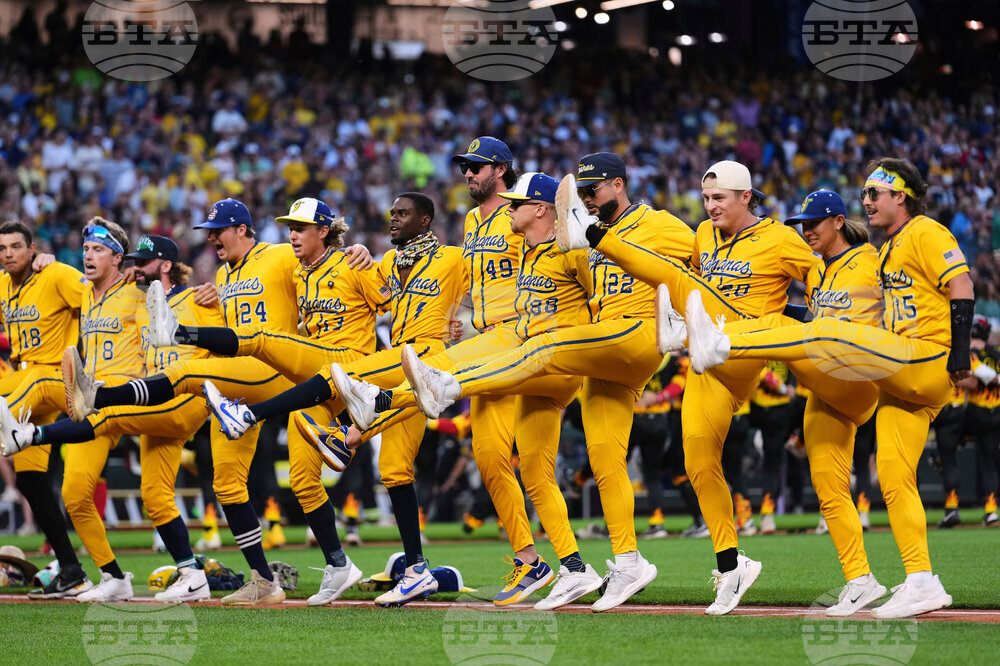 FILE - The Savannah Bananas do a kick line before their game against the Firefighters during their "Banana Ball World Tour," Sept. 19, 2025, in Seattle. (AP Photo/Lindsey Wasson, File)