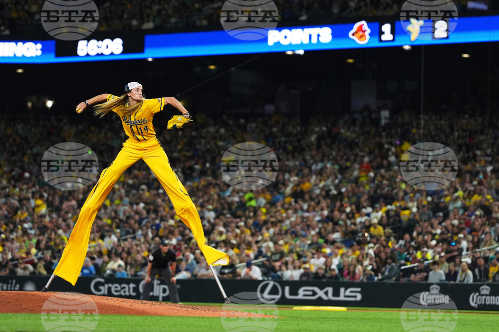 FILE - Savannah Bananas' Dakota "Stilts" Albritton pitches against the Firefighters during their "Banana Ball World Tour," Sept. 19, 2025, in Seattle. (AP Photo/Lindsey Wasson, File)