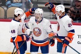 New York Islanders' Jonathan Drouin (29) celebrates after his goal with Matthew Schaefer (48) and Scott Mayfield (24) during the first period of an NHL hockey game against the Pittsburgh Penguins in Pittsburgh, Thursday, Oct. 9, 2025. (AP Photo/Gene J. Puskar)