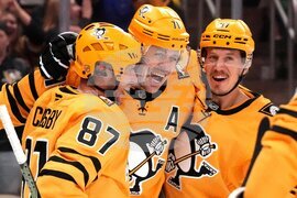 Pittsburgh Penguins' Sidney Crosby (87) celebrates after his goal with Evgeni Malkin (71) and Rickard Rakell (67) during the second period of an NHL hockey game against the New York Islanders in Pittsburgh, Thursday, Oct. 9, 2025. (AP Photo/Gene J. Puskar)