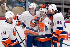 New York Islanders' Jonathan Drouin (29) celebrates after his goal with Matthew Schaefer (48), Scott Mayfield (24) and Emil Heineman (51) during the first period of an NHL hockey game against the Pittsburgh Penguins in Pittsburgh, Thursday, Oct. 9, 2025. (AP Photo/Gene J. Puskar)