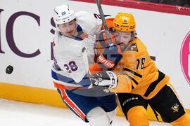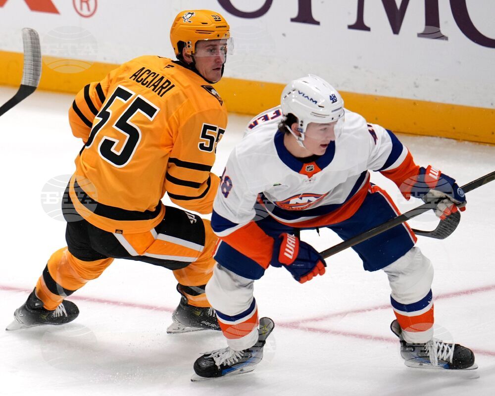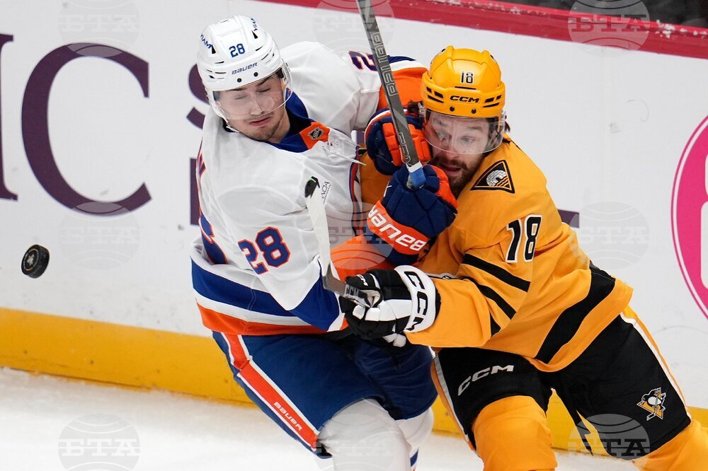 Pittsburgh Penguins' Tommy Novak (18) is checked off the puck by New York Islanders' Alexander Romanov (28) during the first period of an NHL hockey game in Pittsburgh, Thursday, Oct. 9, 2025. (AP Photo/Gene J. Puskar)