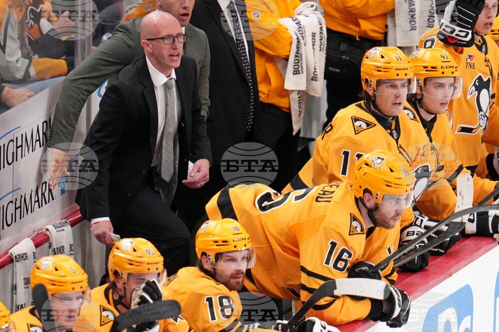 Pittsburgh Penguins head coach Dan Muse, top left, yells instructions during the third period of an NHL hockey game against the New York Islanders in Pittsburgh, Thursday, Oct. 9, 2025. (AP Photo/Gene J. Puskar)