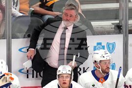 New York Islanders head coach Patrick Roy, center top, stands behind his bench during the first period of an NHL hockey game against the Pittsburgh Penguins in Pittsburgh, Thursday, Oct. 9, 2025. (AP Photo/Gene J. Puskar)
