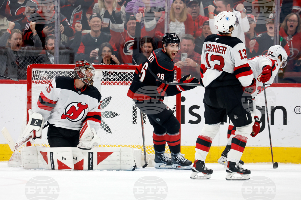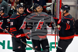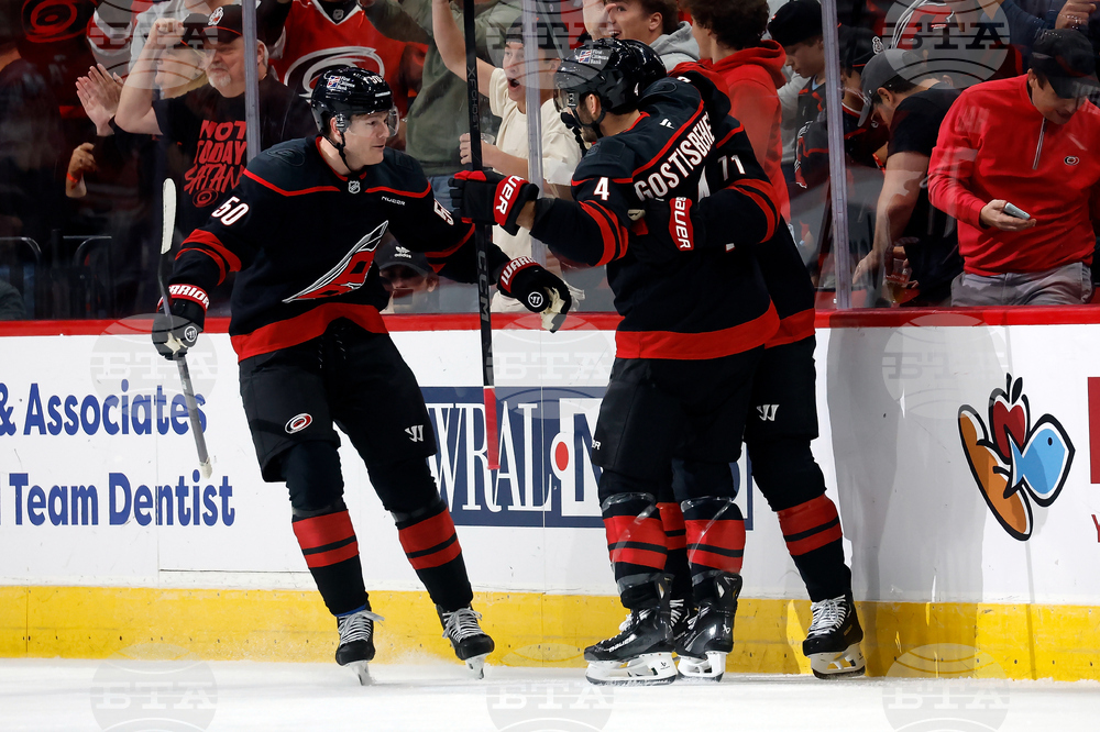 Carolina Hurricanes Eric Robinson (50) and Shayne Gostisbehere (4) celebrate with Taylor Hall (71) after Hall's goal during the first period of an NHL hockey game against the New Jersey Devils in Raleigh, N.C., Thursday, Oct. 9, 2025. (AP Photo/Karl DeBlaker)