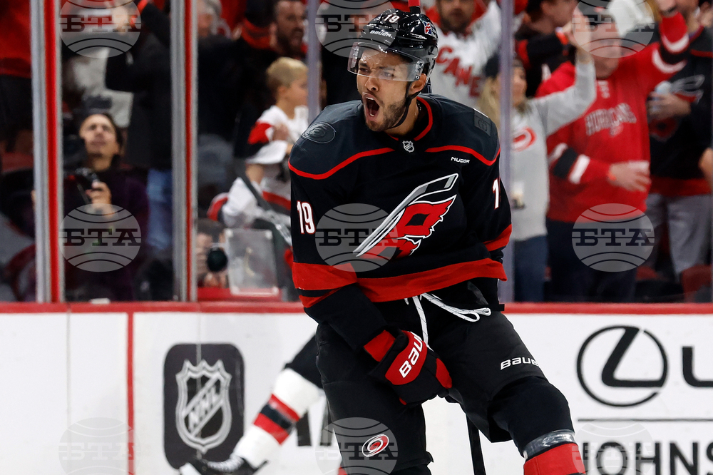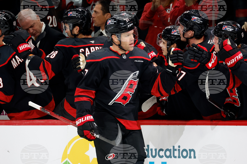 Carolina Hurricanes Taylor Hall (71) celebrates after his goal along the bench during the first period of an NHL hockey game against the New Jersey Devils in Raleigh, N.C., Thursday, Oct. 9, 2025. (AP Photo/Karl DeBlaker)