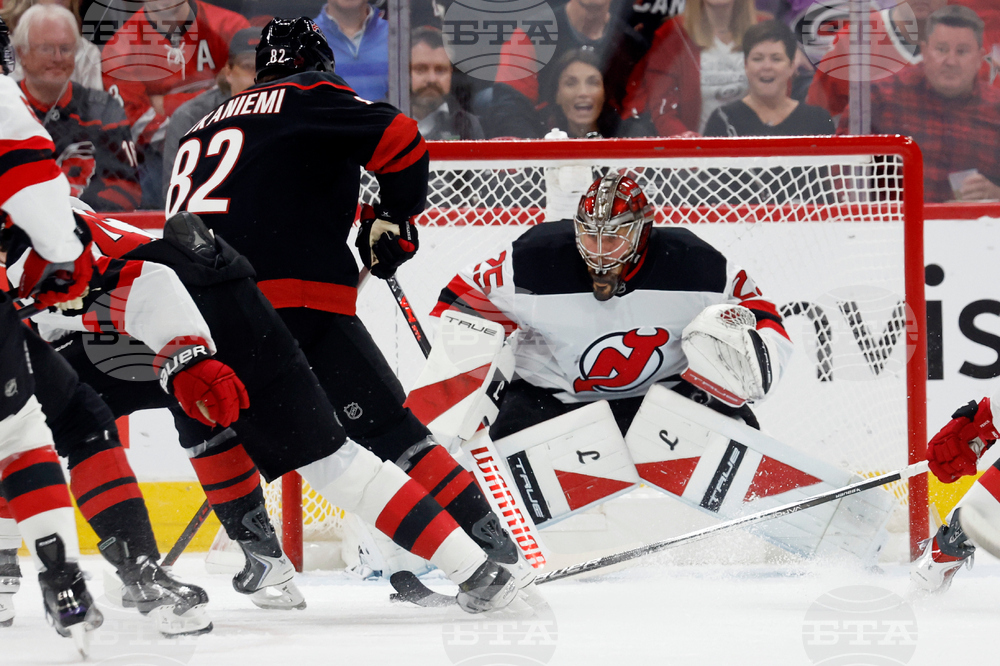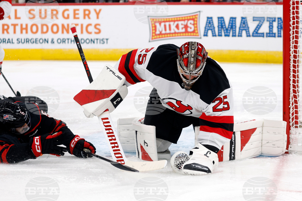 New Jersey Devils goaltender Jacob Markstrom blocks a shot by the Carolina Hurricanes during the second period of an NHL hockey game in Raleigh, N.C., Thursday, Oct. 9, 2025. (AP Photo/Karl DeBlaker)