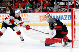 New Jersey Devils' Ondrej Palat (18) controls the puck around Carolina Hurricanes goaltender Frederik Andersen (31) during the first period of an NHL hockey game in Raleigh, N.C., Thursday, Oct. 9, 2025. (AP Photo/Karl DeBlaker)