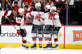 New Jersey Devils' Dougie Hamilton, second from left, celebrates with teammates after his goal during the second period of an NHL hockey game against the Carolina Hurricanes in Raleigh, N.C., Thursday, Oct. 9, 2025. (AP Photo/Karl DeBlaker)
