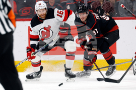 New Jersey Devils' Nico Hischier (13) is chased by Carolina Hurricanes' Jordan Staal (11) during the second period of an NHL hockey game in Raleigh, N.C., Thursday, Oct. 9, 2025. (AP Photo/Karl DeBlaker)
