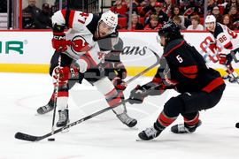 New Jersey Devils' Ondrej Palat (18) battles for the puck with Carolina Hurricanes' Shayne Gostisbehere (4) during the first period of an NHL hockey game in Raleigh, N.C., Thursday, Oct. 9, 2025. (AP Photo/Karl DeBlaker)