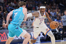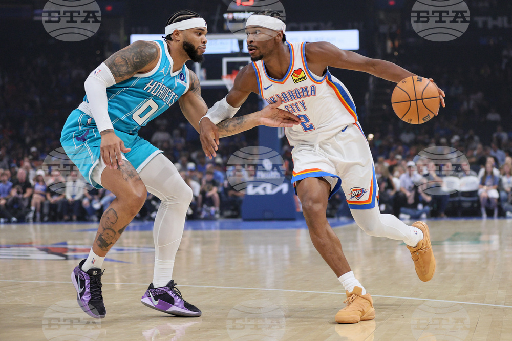 Oklahoma City Thunder guard Shai Gilgeous-Alexander (2) drives against Charlotte Hornets forward Miles Bridges (0) during the first half of a preseason NBA basketball game Thursday, Oct. 9, 2025, in Oklahoma City. (AP Photo/Nate Billings)