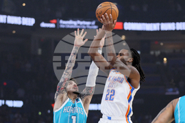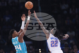 Charlotte Hornets forward Brandon Miller (24) shoots over Oklahoma City Thunder guard Cason Wallace (22) during the first half of a preseason NBA basketball game Thursday, Oct. 9, 2025, in Oklahoma City. (AP Photo/Nate Billings)