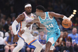 Charlotte Hornets forward Brandon Miller (24) handles the ball as Oklahoma City Thunder guard Luguentz Dort (5) defends during the first half of a preseason NBA basketball game Thursday, Oct. 9, 2025, in Oklahoma City. (AP Photo/Nate Billings)