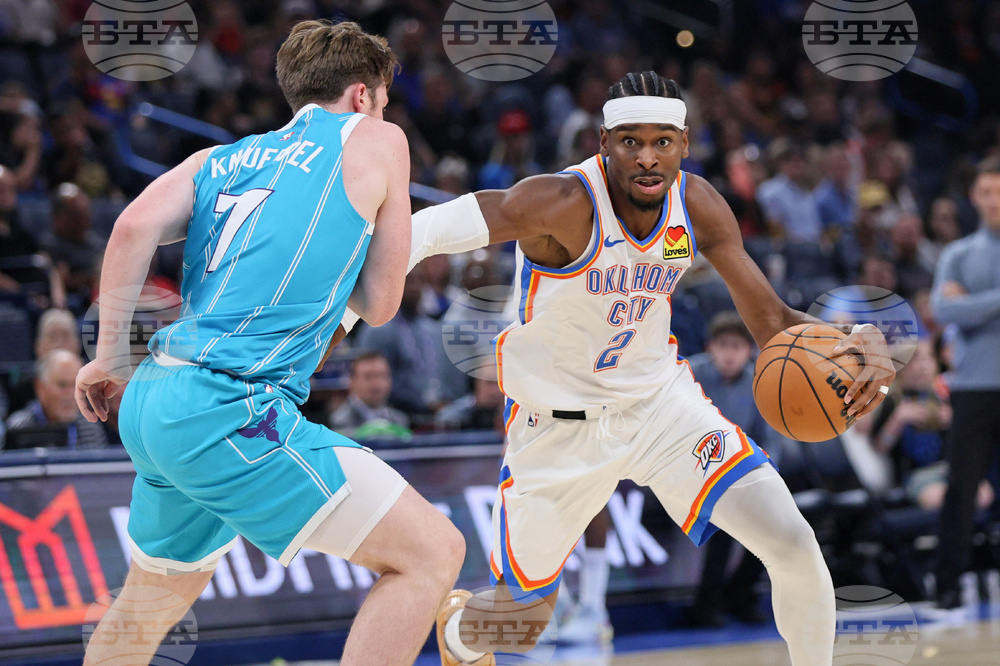 Oklahoma City Thunder guard Shai Gilgeous-Alexander (2) looks to pass the ball away from Charlotte Hornets forward Brandon Miller, right, during the first half of a preseason NBA basketball game Thursday, Oct. 9, 2025, in Oklahoma City. (AP Photo/Nate Billings)