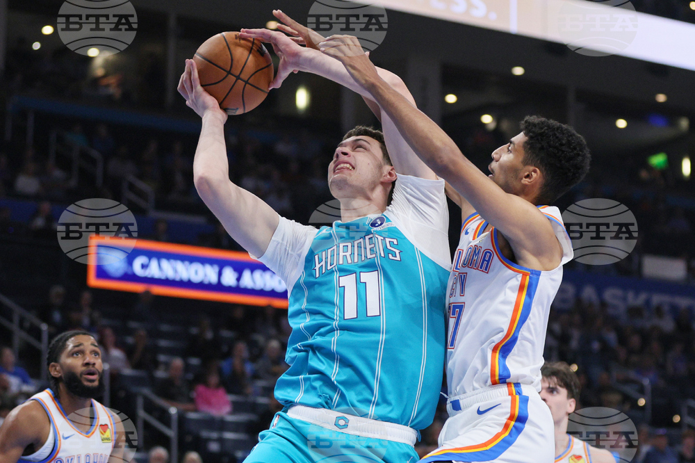 Charlotte Hornets center Ryan Kalkbrenner (11) prepares to shoot as Oklahoma City Thunder forward Malevy Leons, right, defends during the second half of a preseason NBA basketball game Thursday, Oct. 9, 2025, in Oklahoma City. (AP Photo/Nate Billings)
