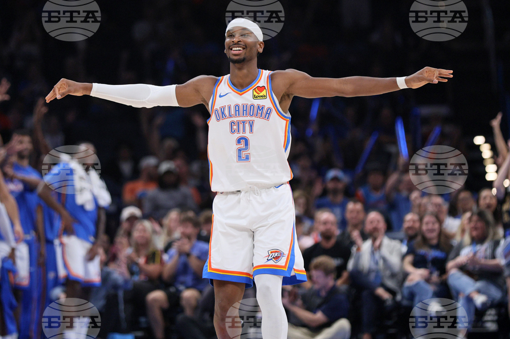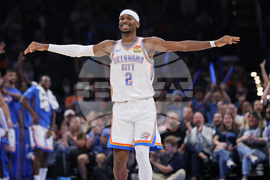 Oklahoma City Thunder guard Shai Gilgeous-Alexander reacts after a teammate scored during the first half of a preseason NBA basketball game against the Charlotte Hornets, Thursday, Oct. 9, 2025, in Oklahoma City. (AP Photo/Nate Billings)