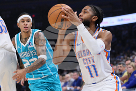 Oklahoma City Thunder guard Luguentz Dort (5) drives against Charlotte Hornets forward Miles Bridges (0) during the first half of a preseason NBA basketball game, Thursday, Oct. 9, 2025, in Oklahoma City. (AP Photo/Nate Billings)