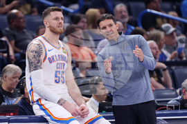 Oklahoma City Thunder head coach Mark Daigneault, right, talks to center Isaiah Hartenstein (55) during the first half of a preseason NBA basketball game against the Charlotte Hornets, Thursday, Oct. 9, 2025, in Oklahoma City. (AP Photo/Nate Billings)