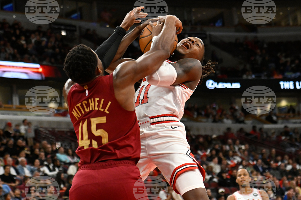 Chicago Bulls' Ayo Dosunmu (11) battles Cleveland Cavaliers' Donovan Mitchell (45) for a rebound during the first half of an NBA basketball preseason game in Chicago, Thursday, Oct. 9, 2025. (AP Photo/Paul Beaty)