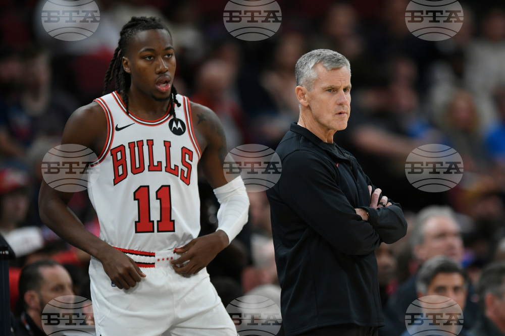 Chicago Bulls head coach Billy Donovan, right, looks on along with Ayo Dosunmu (11) during the first half of an NBA basketball preseason game against the Cleveland Cavaliers in Chicago, Thursday, Oct. 9, 2025. (AP Photo/Paul Beaty)