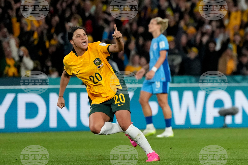 FILE - Australia's Sam Kerr celebrates after scoring her side's first goal during the Women's World Cup semifinal soccer match between Australia and England at Stadium Australia in Sydney, Australia, Aug. 16, 2023. (AP Photo/Rick Rycroft, File)