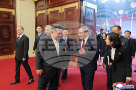 From left, Vietnamese Communist Party General Secretary To Lam, North Korean leader Kim Jong Un, Chinese Premier Li Qiang and Russian Security Council Deputy Chairman and the head of the United Russia party Dmitry Medvedev attend a reception marking the 80th anniversary of the ruling Workers' Party in Pyongyang, North Korea, Friday, Oct. 10, 2025. (Ekaterina Shtukina, Sputnik, Pool Photo via AP)