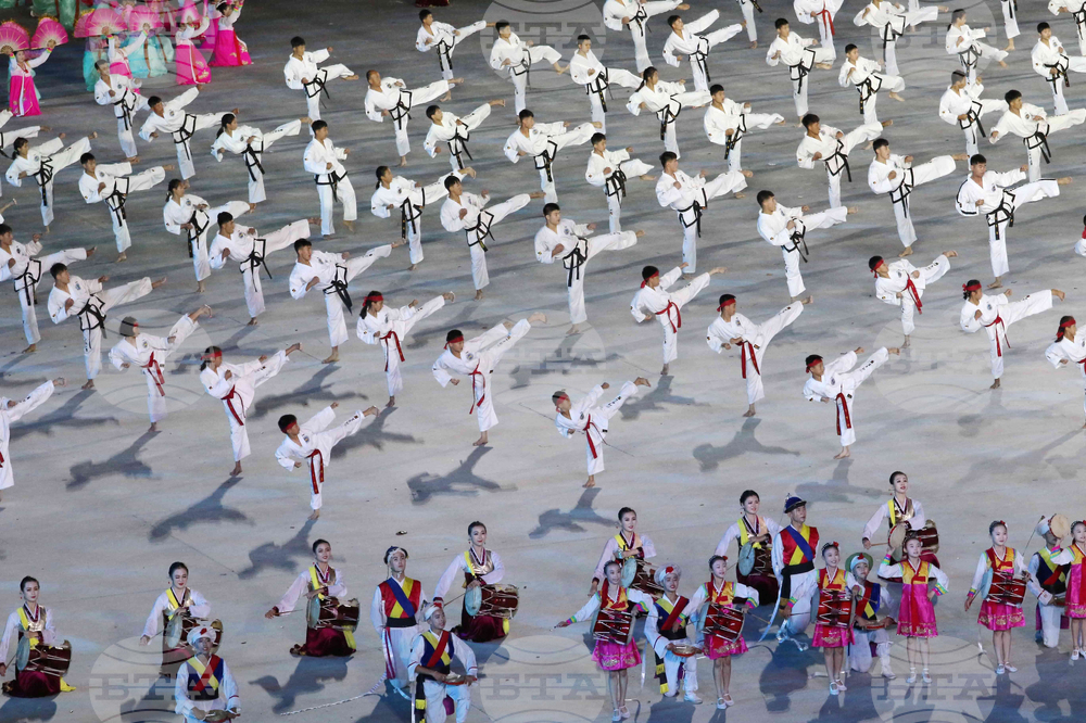 People perform at the May Day Stadium in Pyongyang, North Korea, Thursday, Oct. 9, 2025, during the ceremony marking the 80th anniversary of the founding of the ruling Workers' Party. (AP Photo/Jon Chol Jin)