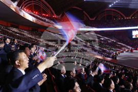 People watch the mass gymnastics and artistic performance during the ceremony marking the 80th founding anniversary of the ruling Workers' Party at the May Day Stadium in Pyongyang, North Korea, Thursday evening, Oct. 9, 2025. (AP Photo/Cha Song Ho)
