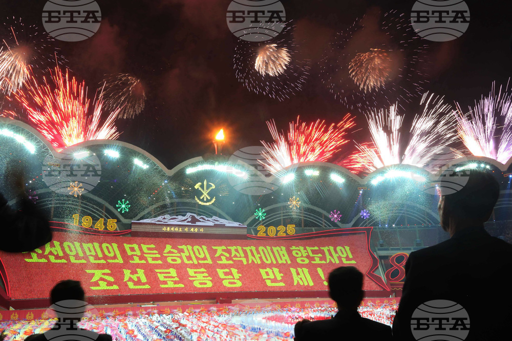 Fireworks explode at the May Day Stadium in Pyongyang, North Korea, Thursday, Oct. 9, 2025, during the ceremony marking the 80th anniversary of the founding of the ruling Workers' Party. The words at center read "Long live the Workers' Party of Korea, the organizer and guider of all the victories of the Korean people!" (AP Photo/Jon Chol Jin)