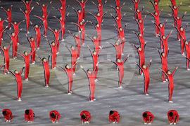 Gymnasts perform during the ceremony marking the 80th founding anniversary of the ruling Workers' Party at the May Day Stadium in Pyongyang, North Korea, Thursday evening, Oct. 9, 2025. (AP Photo/Cha Song Ho)