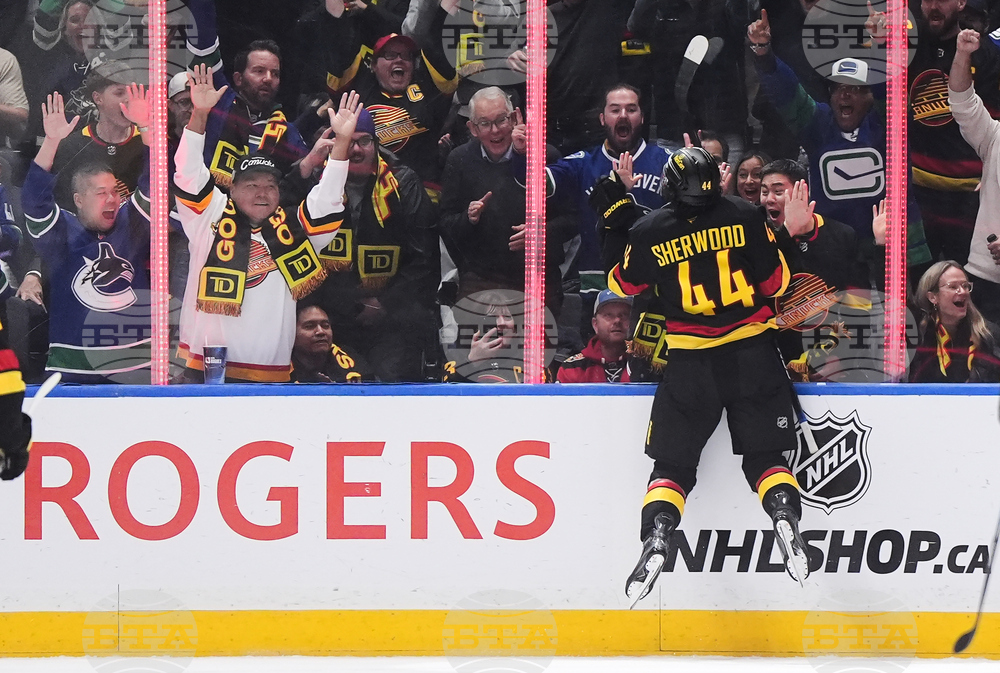 Vancouver Canucks' Kiefer Sherwood (44) celebrates after his goal against the Calgary Flames during the first period of an NHL hockey game in Vancouver, British Columbia, Thursday, Oct. 9, 2025. (Darryl Dyck/The Canadian Press via AP)