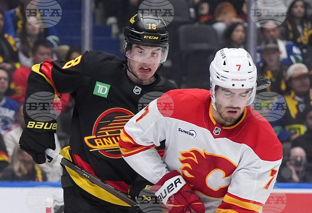 Vancouver Canucks' Marcus Pettersson, left, checks Calgary Flames' Ryan Lomberg, front right, during the first period of an NHL hockey game in Vancouver, British Columbia, Thursday, Oct. 9, 2025. (Darryl Dyck/The Canadian Press via AP)