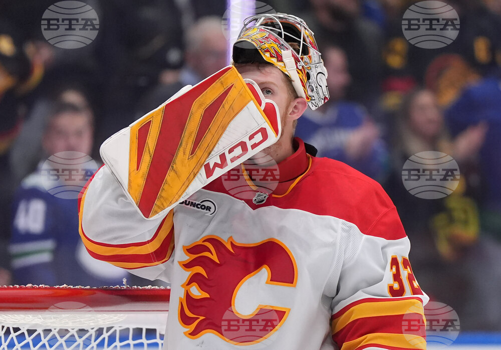 Calgary Flames goalie Dustin Wolf looks on after allowing a goal to Vancouver Canucks' Jonathan Lekkerimaki, not seen, during the third period of an NHL hockey game in Vancouver, on Thursday, Oct. 9, 2025. (Darryl Dyck/The Canadian Press via AP)