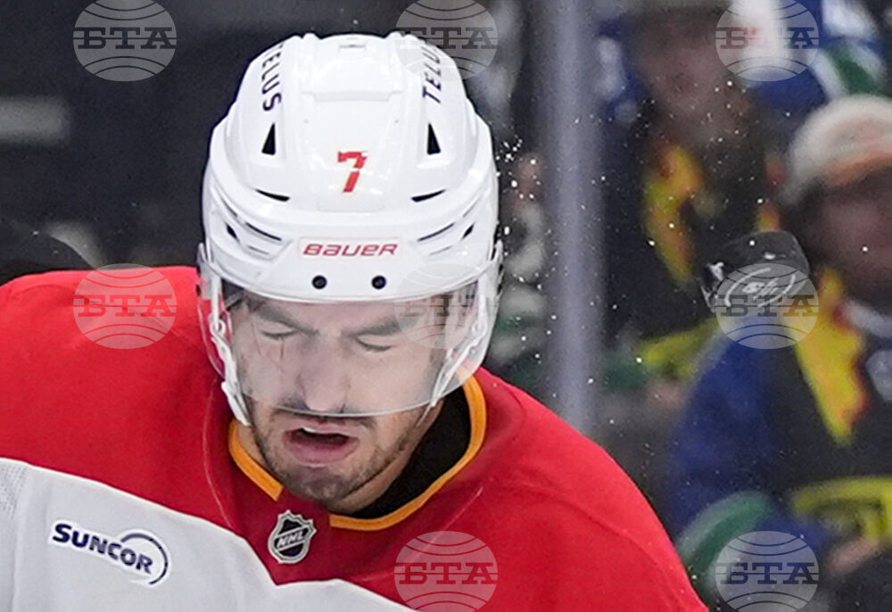Calgary Flames' Kevin Bahl is struck by the puck during the third period of an NHL hockey game against the Vancouver Canucks in Vancouver, on Thursday, Oct. 9, 2025. (Darryl Dyck/The Canadian Press via AP)