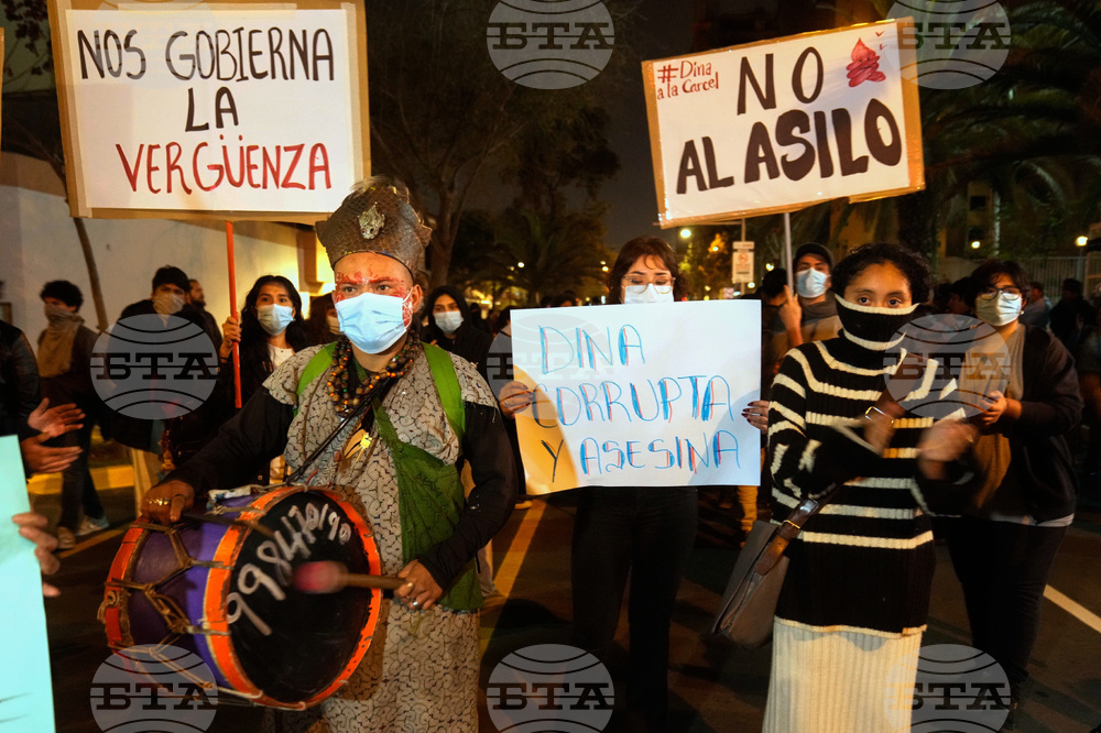 Opponents of Peruvian President Dina Boluarte protest outside of the Ecuadorian Embassy in Lima, Peru, Thursday, Oct. 9, 2025. (AP Photo/Martin Mejia)