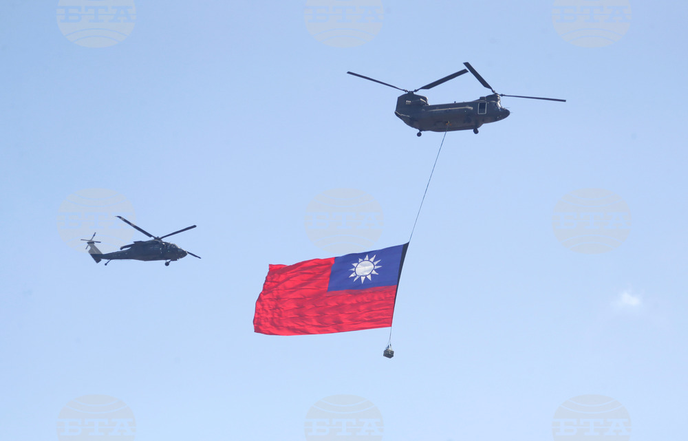 A helicopter flies over the President Office with a national flag during National Day celebrations in front of the Presidential Building in Taipei, Taiwan, Friday, Oct. 10, 2025. (AP Photo/Chiang Ying-ying)