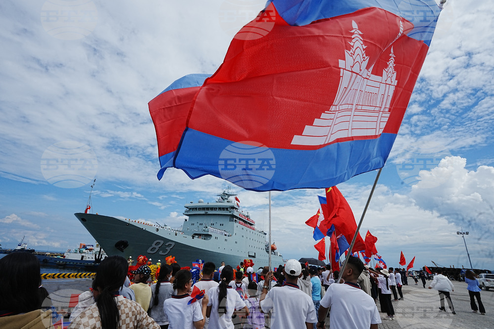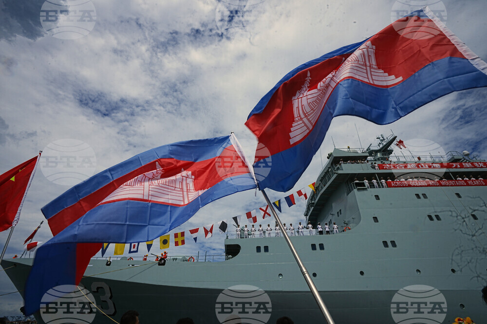Cambodia's national flags flutter as Chinese warship Qijiguang arrives at a Cambodian commercial port in Sihanoukville, Friday, Oct. 10, 2025. (AP Photo/Heng Sinith)