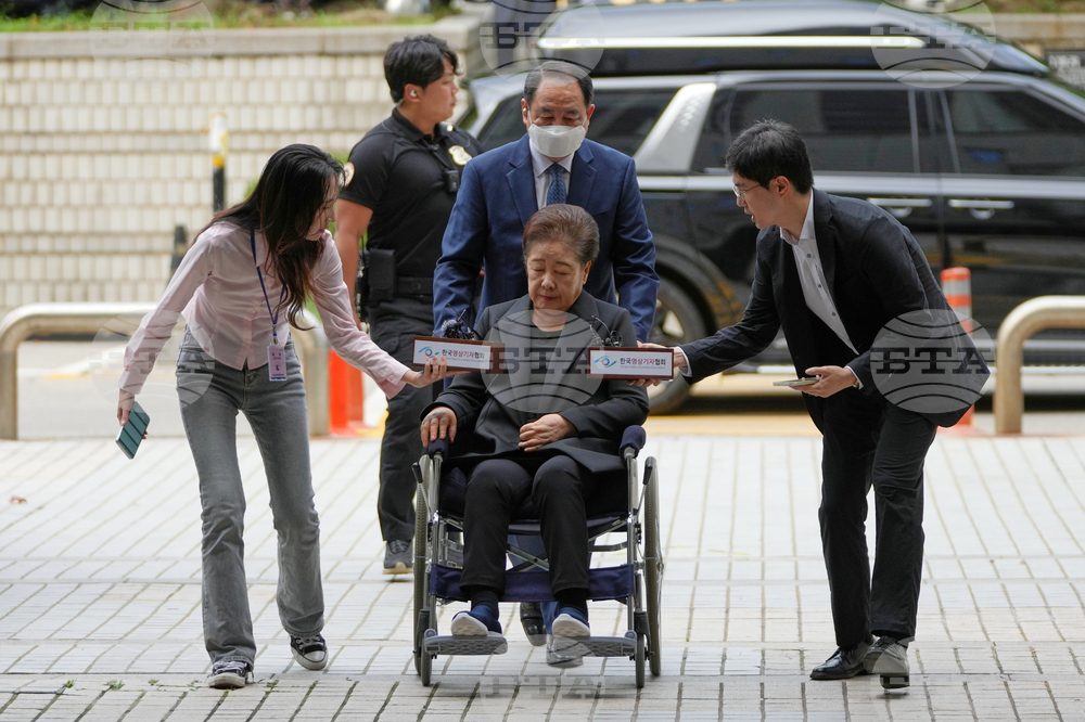 Hak Ja Han, bottom center, the leader of South Korea's Unification Church, arrives at Seoul Central District Court in Seoul, South Korea Monday, Sept. 22, 2025. (AP Photo/Lee Jin-man)